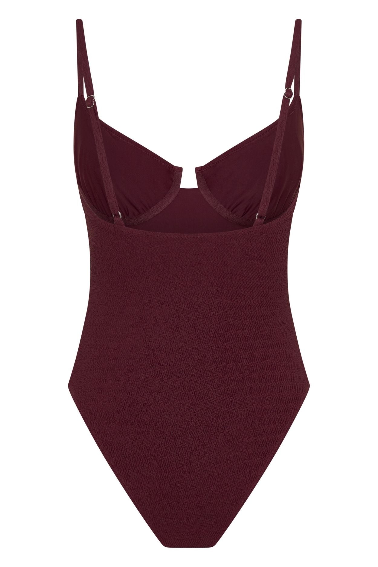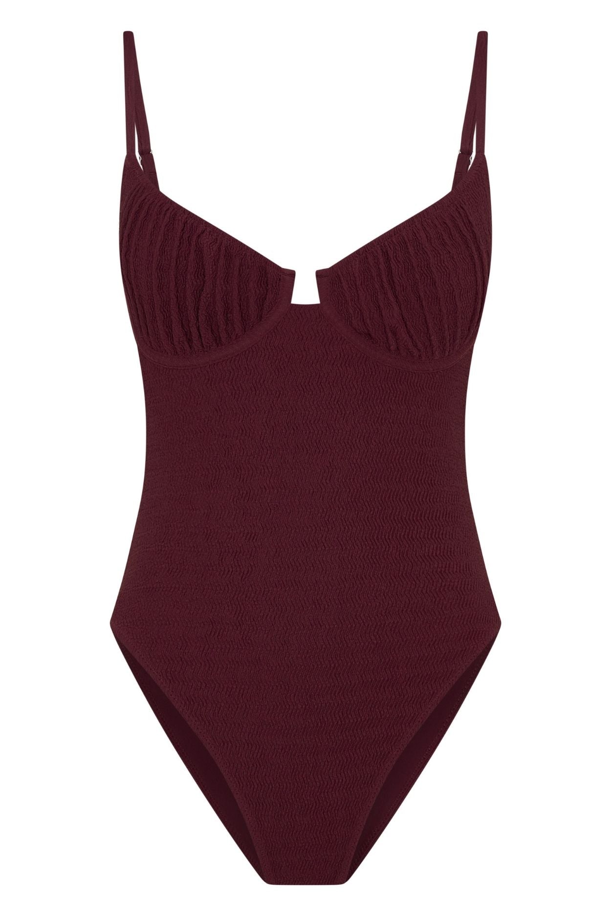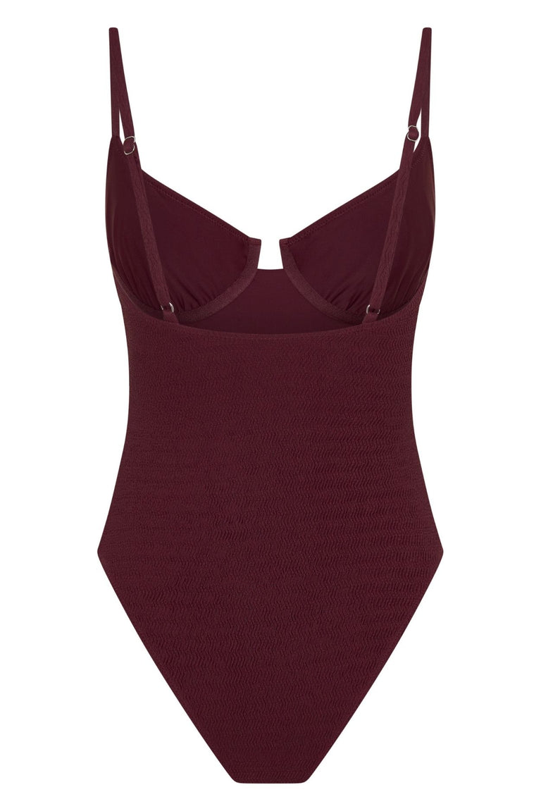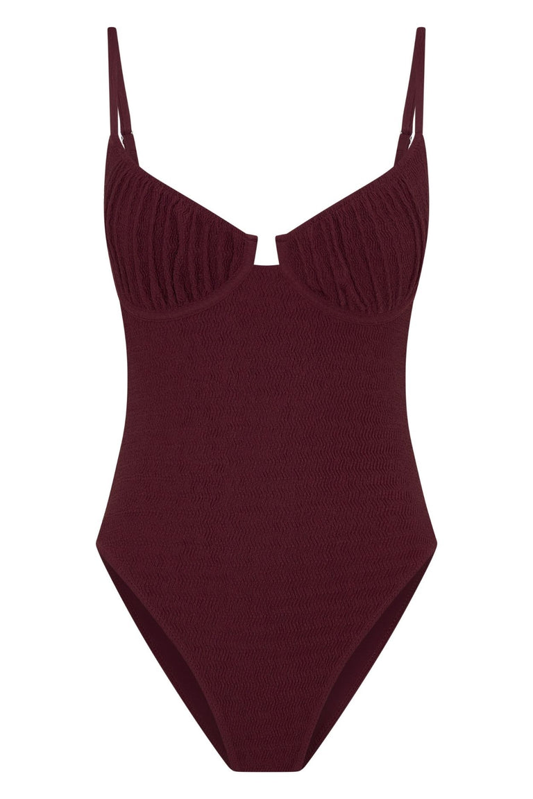 Bask in the sun in a style built for all-day confidence. The Ria One Piece in Mulberry combines structured support with a flattering silhouette, featuring ruched cups, adjustable straps and high-cut legs in a luxurious textured crinkle fabric. Designed to move with you from beach to poolside, this one piece delivers medium coverage with a resort-ready finish.