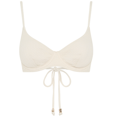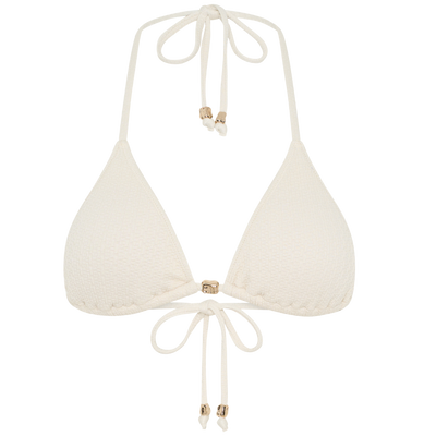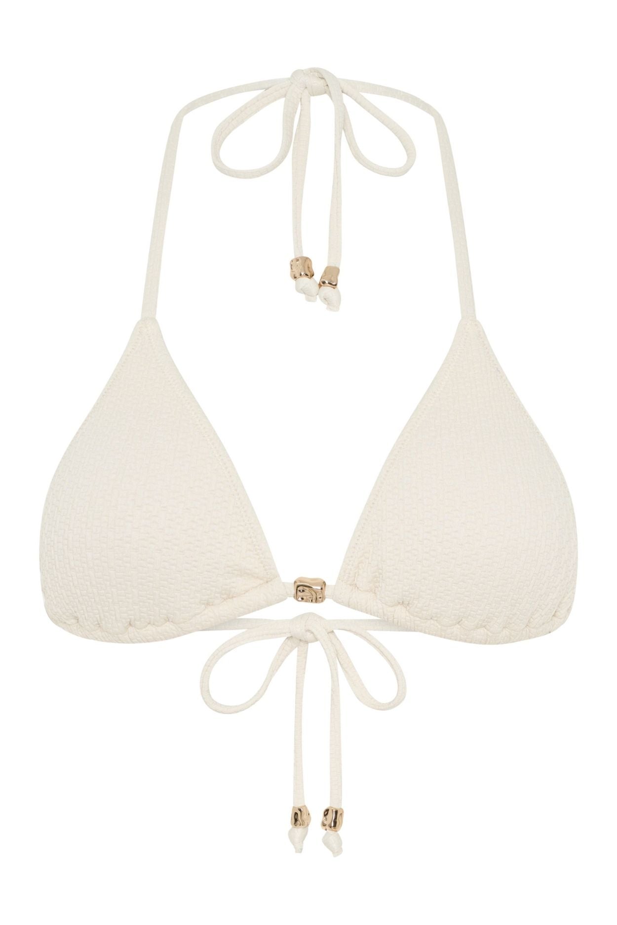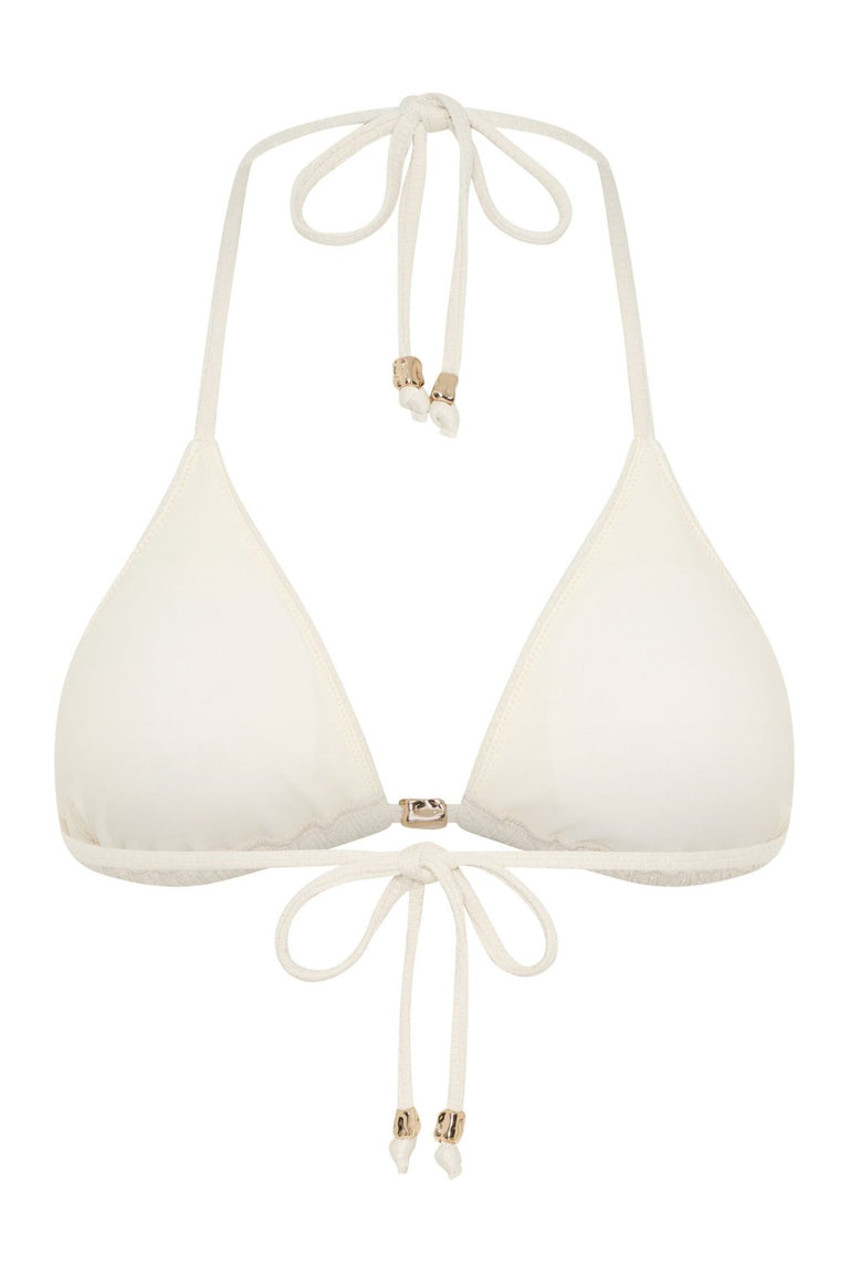 Minimalist with a touch of charm, the Darcie Bikini Top is your must-have summer staple. This classic triangle silhouette is elevated with a delicate beaded centre detail, adding a subtle statement to your beachside look. Designed for adjustable comfort, it features sliding cups and ties at the neck and back, giving you the flexibility to wear it your way.